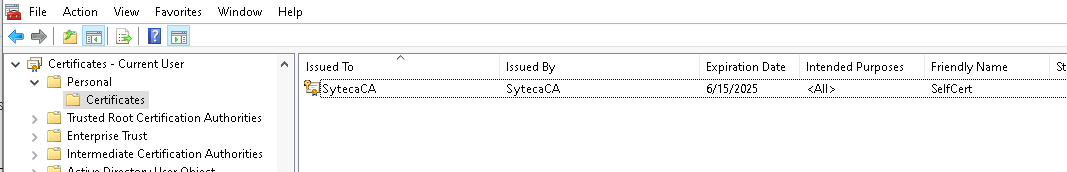 New-SelfSignedCertificate -Type Custom -DnsName "server", "server.domain.local",'192.168.0.1' -KeyUsage "DigitalSignature","KeyEncipherment","KeyAgreement" -KeyAlgorithm RSA -KeyLength 4096 -CertStoreLocation "cert:\CurrentUser\My" -FriendlyName "SelfCert" -NotAfter (Get-Date).AddMonths(36) -Subject "SytecaCA"