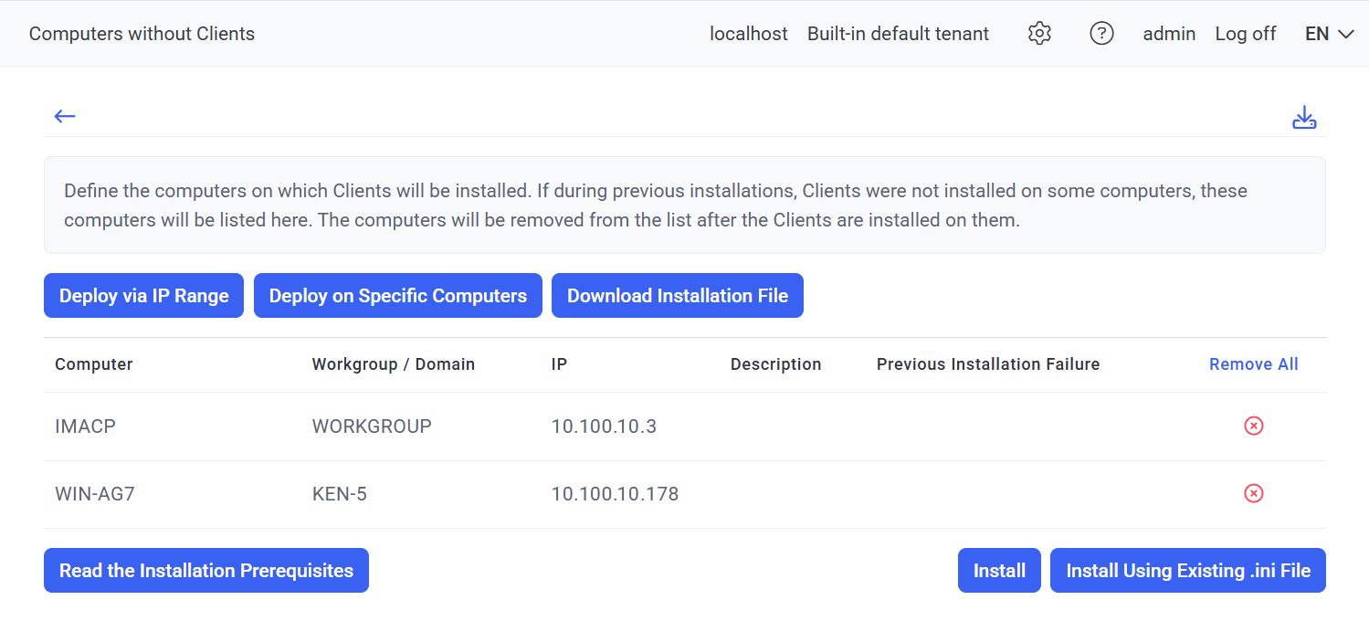 1. On the Computers without Clients page, click Install (at the bottom of the page).