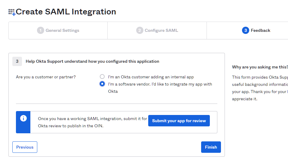 6. On the Feedback page, select the “I’m a software vendor. I'd like…” option as displayed in the screenshot below, and then click Finish to apply the changes.