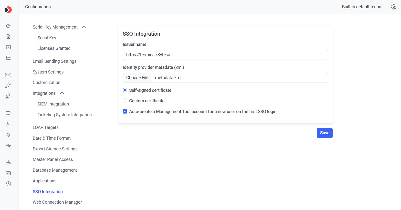 1. Log in to the Syteca Management Tool, and click the Configuration () button (at the top of the Management Tool interface), and then select the SSO Integration tab (on the left)..