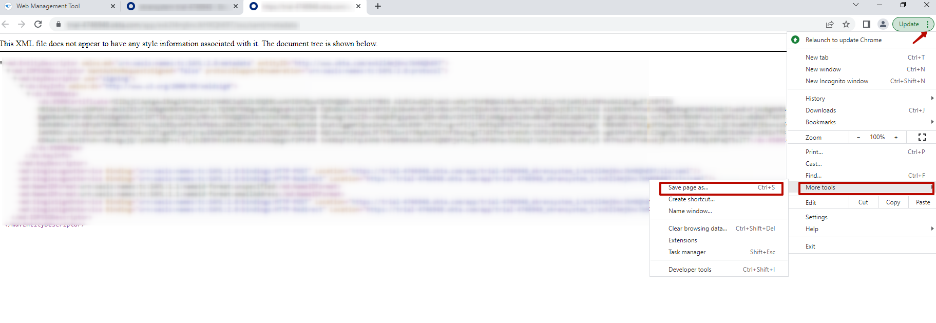 8. Save the information that is then displayed in the new browser tab that opens (e.g. either by pressing Ctrl+S, or by opening your browser options, and selecting the More Tools > Save page as… option (in the Chrome browser) to download the metadata.xml file.