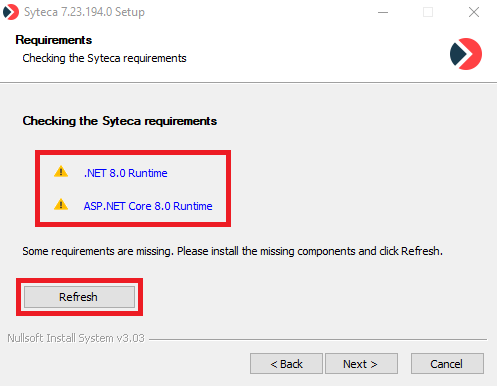 • [Application Server:] .NET 8.0 (.NET 8.0 Runtime and ASP.NET Core 8.0 Runtime) components now need to be installed, which can be done while installing or updating to Syteca Application Server v. 7.23 or higher (by clicking on the links in the list of missing required components displayed on the new Requirements page).