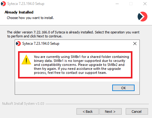 • [Application Server Issues and Error Messages:] SMBv2 or higher now needs to be enabled (since SMBv1 is no longer supported) when using a shared folder to store binary data before installing or updating to Syteca Application Server v. 7.23).
