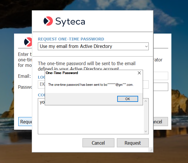 • If the Automatically send one-time passwords to Active Directory users checkbox is enabled, the following pop-up window is displayed, where the user just needs to click the Request button.