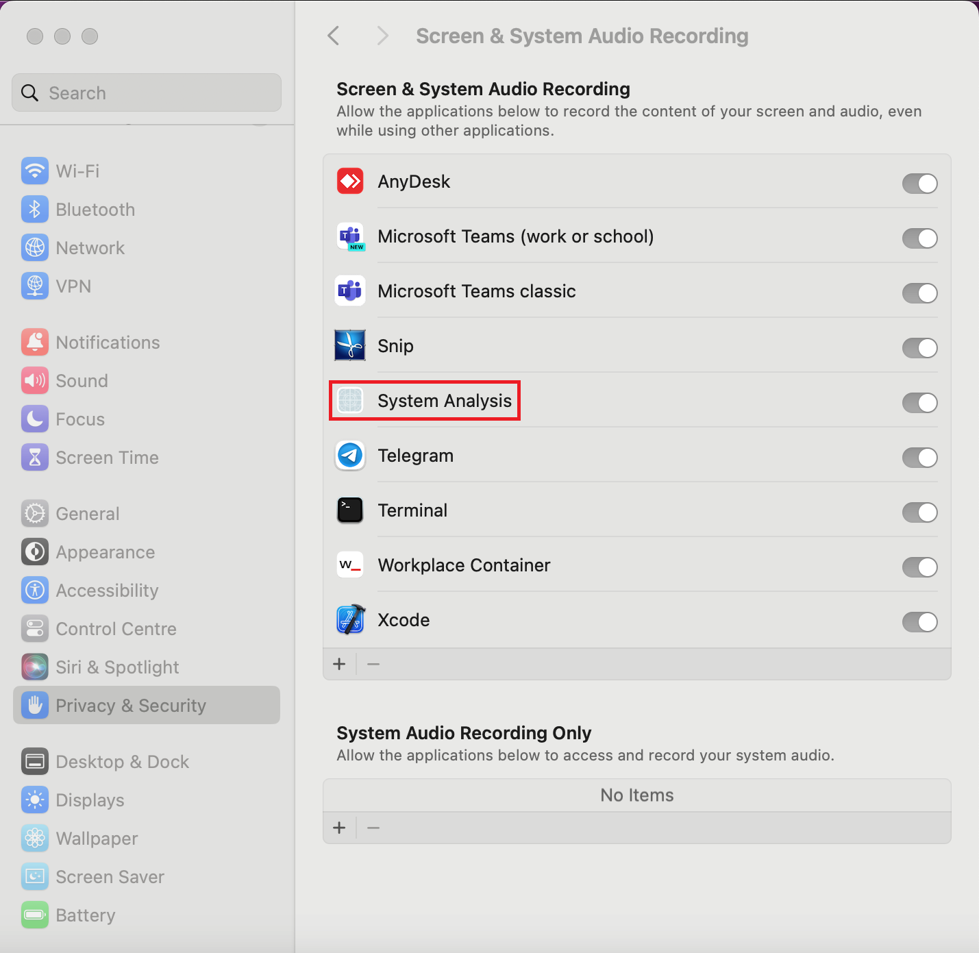 Installation of the macOS Hidden Client is performed in the same way as for the standard macOS Client, except that the Accessibility and Screen & System Audio Recording permissions need to be granted for the System Analysis application (instead of for the “Syteca Session Client” application for the standard macOS Client) to ensure the correct functioning of the Client, either by: