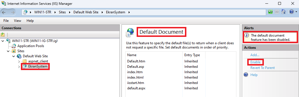 3. In the Actions pane (on the right), click Enable to enable the Default Document setting.