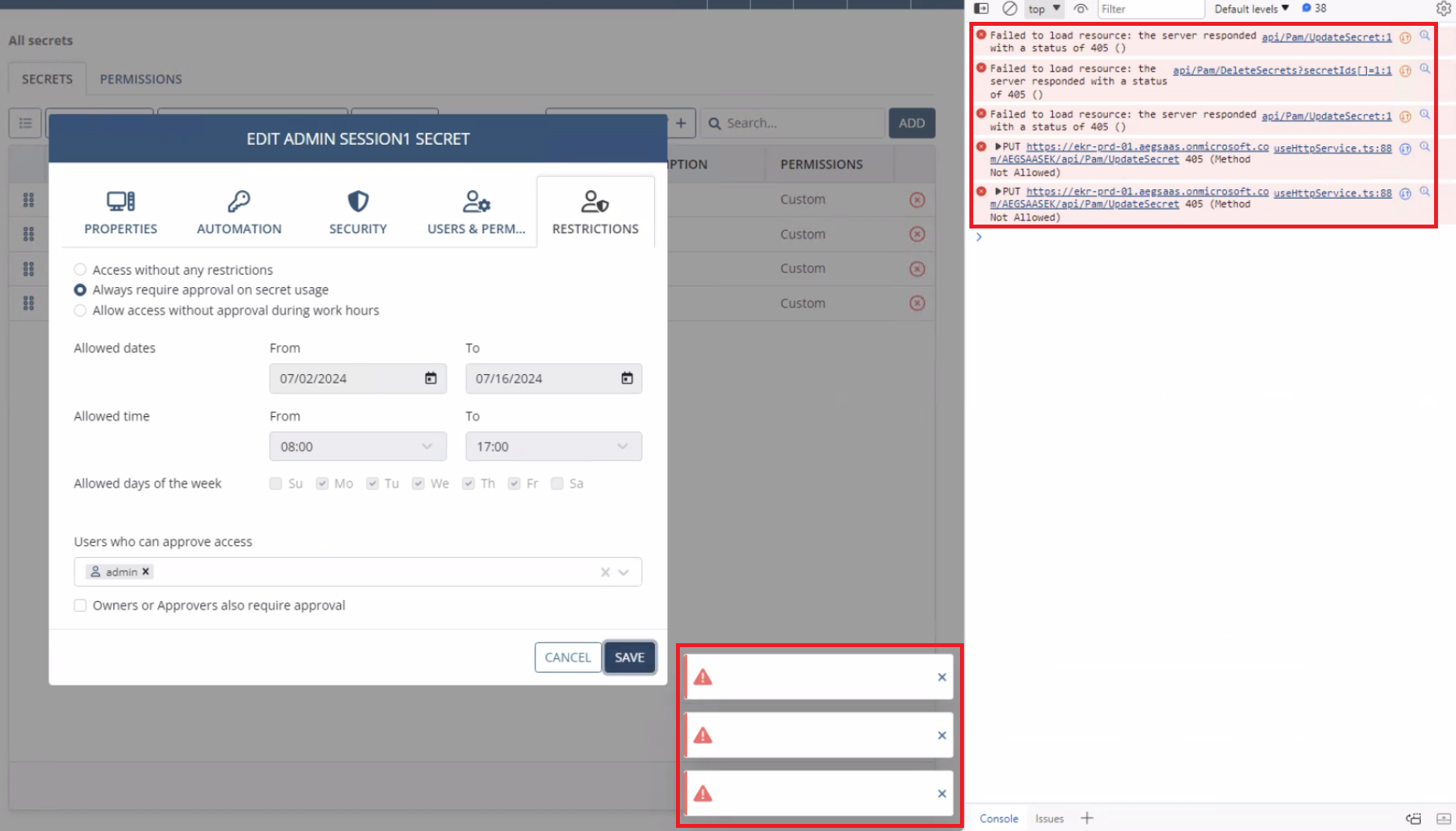 The 405 error code is displayed in the Management Tool when attempting to edit a secret, edit/delete an LDAP target, or delete a report generated, etc.