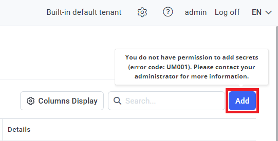 On the Password Management page (on the Secrets tab), the following error is displayed when attempting to add secrets or folders: "You do not have permission to add secrets (error code: UM001)). Please contact your administrator."