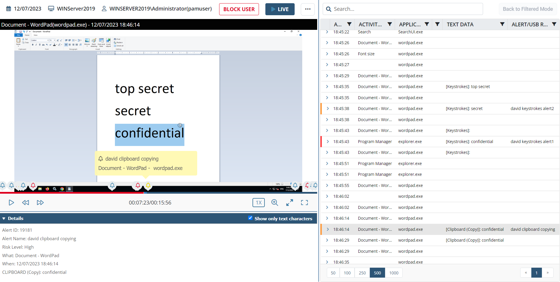 If a record containing keystrokes, or a clipboard or file operation is selected in the Metadata grid, detailed information is displayed in the Details area below the Session Player.
