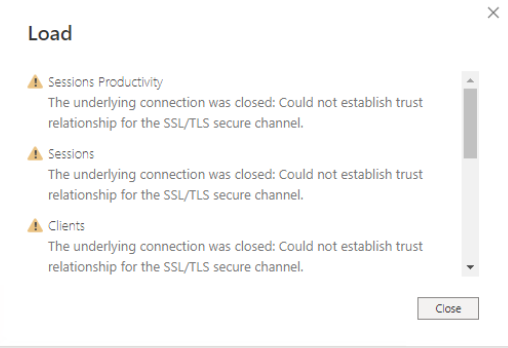 This page describes what to do if you get the following error (as shown in the screenshot below) when integrating the Syteca Data Connector with Microsoft Power BI: