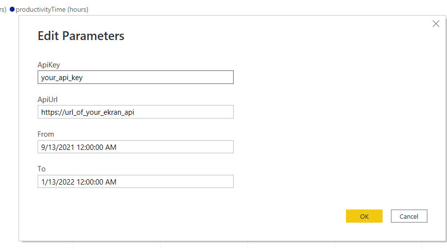 1. In the Power BI report template that was opened, click Transform data > Edit parameters to open the Edit Parameters page, and in the ApiUrl field, if you used the IP address of the machine where the Syteca Data Connector is installed, you need to replace it with the hostname of the machine (e.g. https://<hostname>/ekranapi).