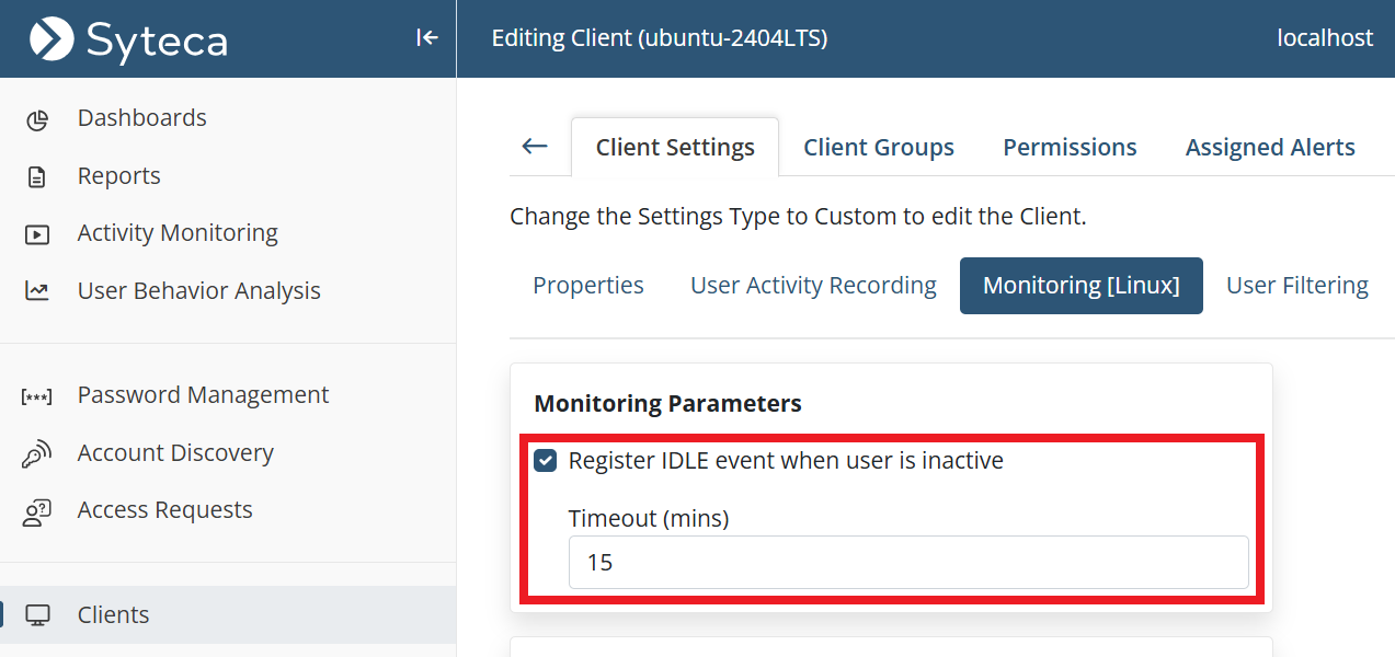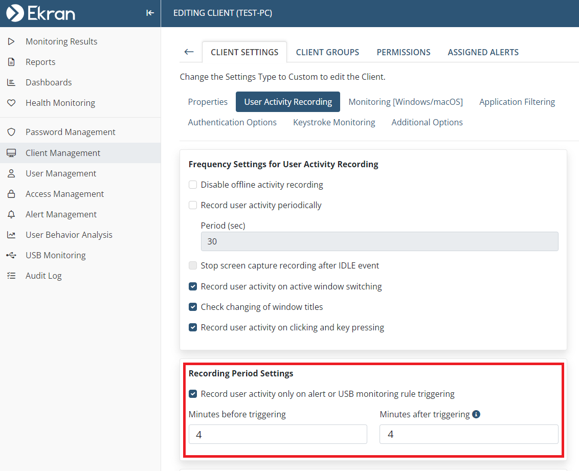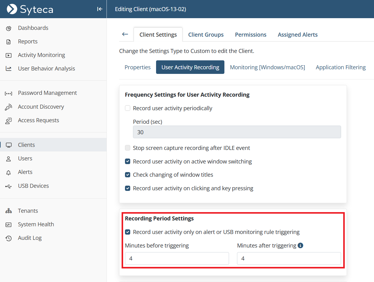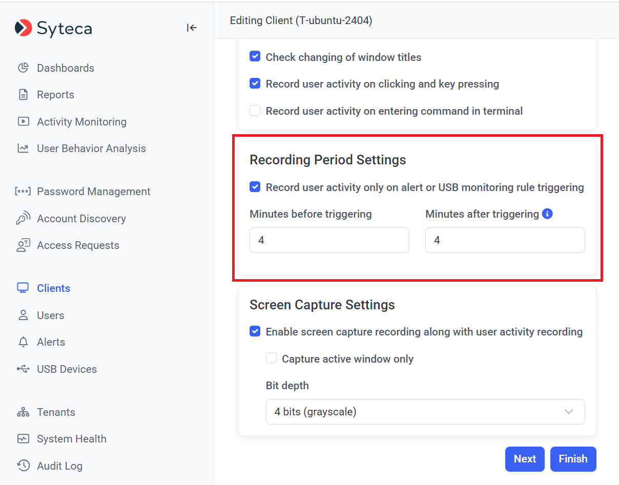 • [Monitoring Linux Clients:] The Record user activity only on alert or USB monitoring rule triggering option is now also available to record user activity on Linux Client computers only in the specified time periods before and after alerts are triggered (in the same way as for Windows and macOS Clients).