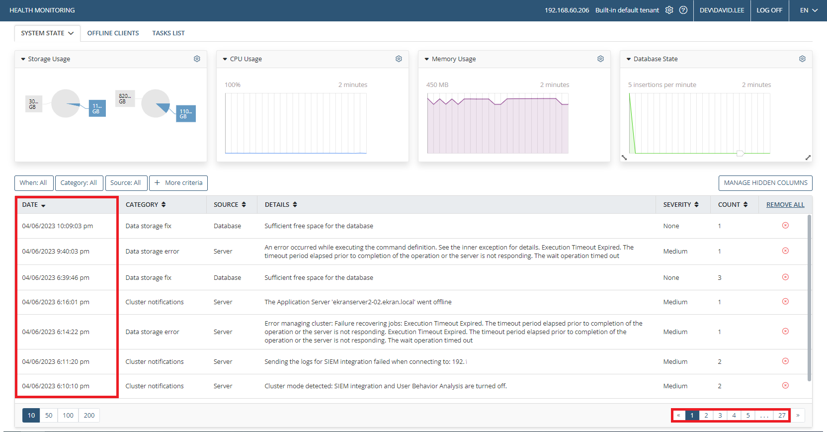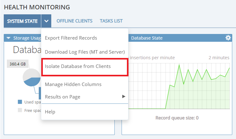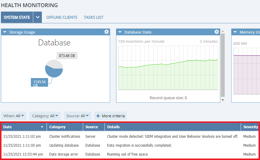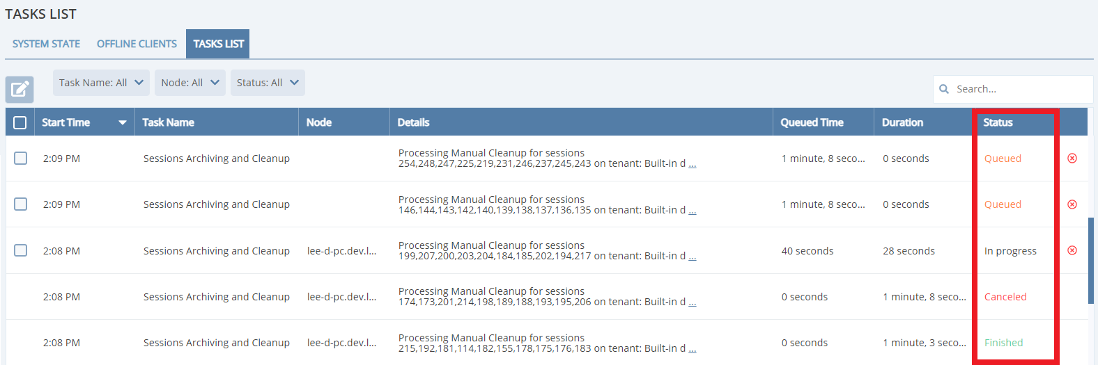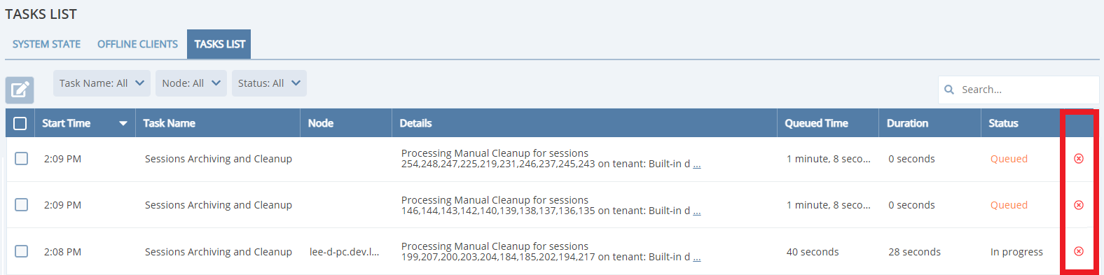 • New “Tasks List” tab on the Health Monitoring page – This new feature and interface is for providing transparency about what is happening on the server side. It shows various types of task queues, so users can check the progress of specific tasks, as well as cancel the tasks. This feature also includes: