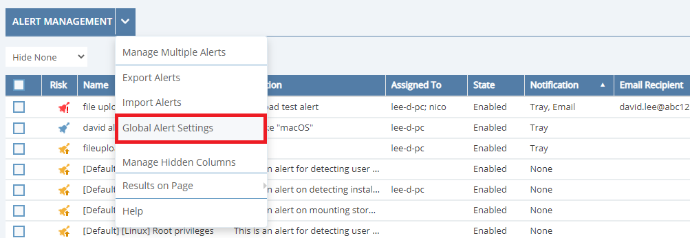 • Alerts (on macOS Clients) – can now be shown to endpoint users (a warning message appears on the Client when an alert is triggered).