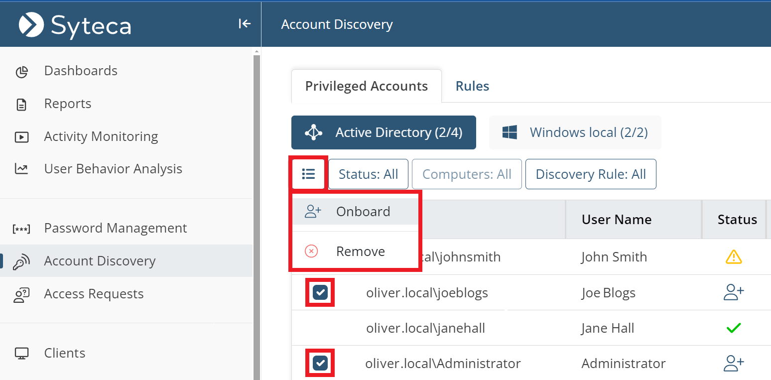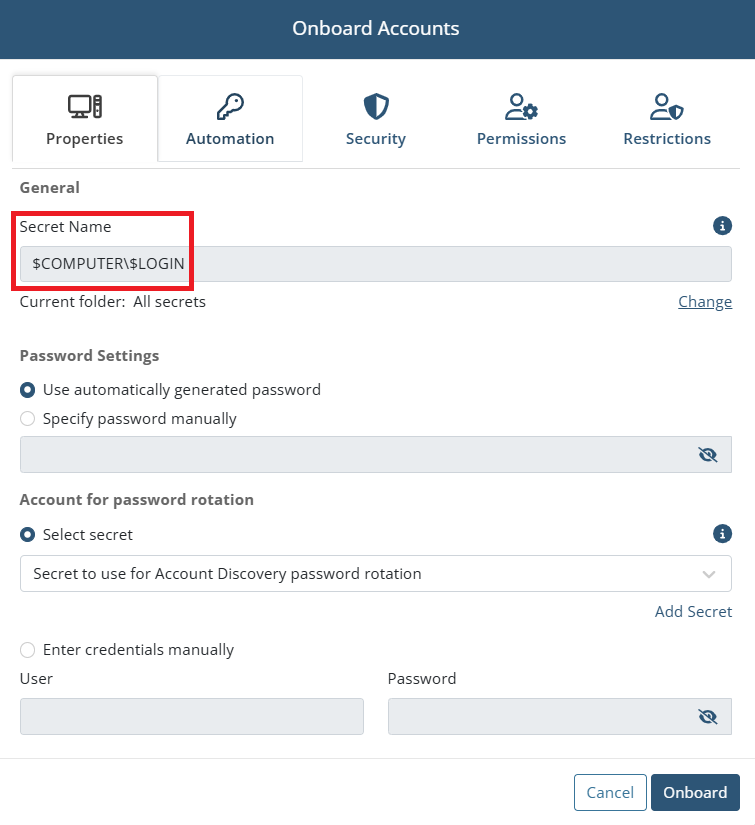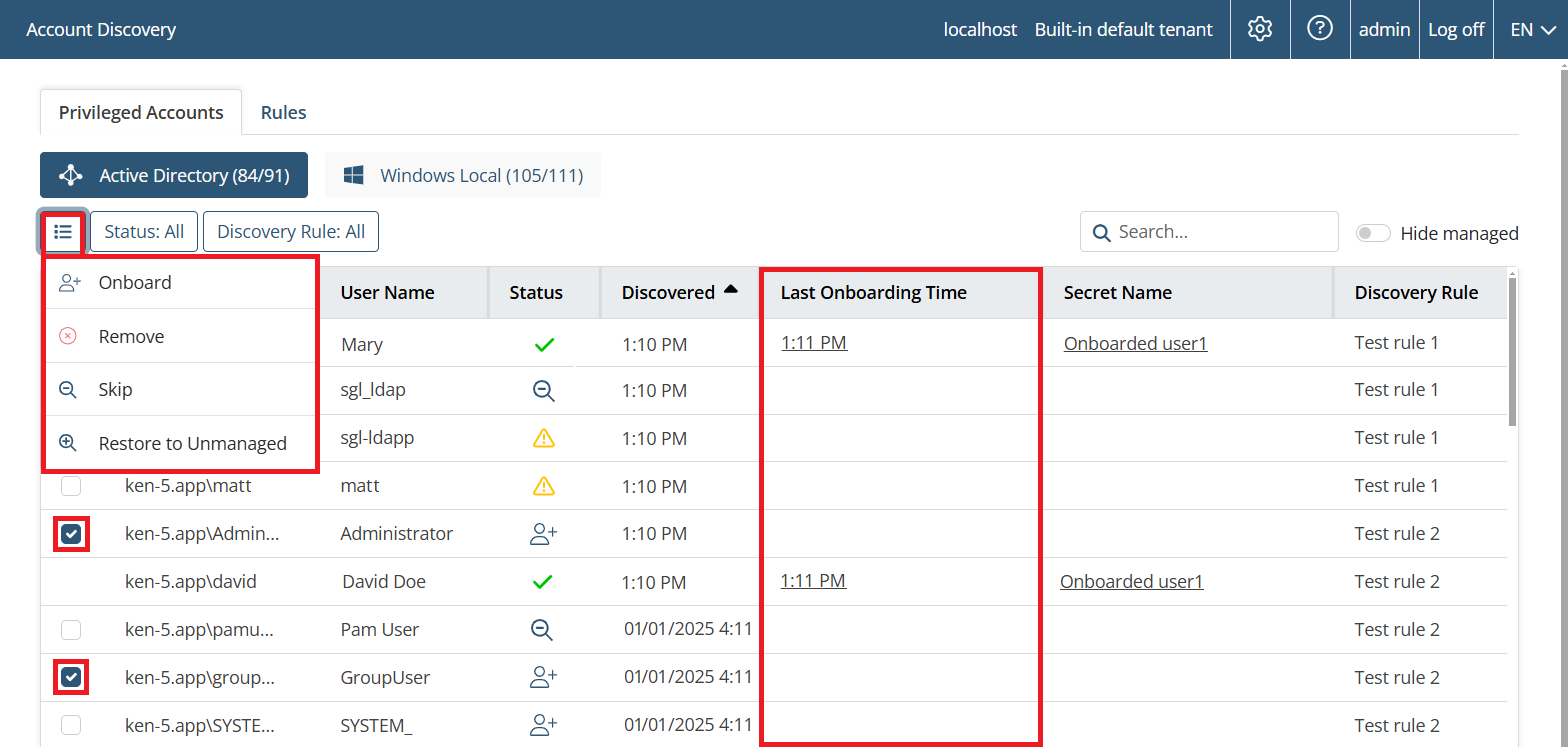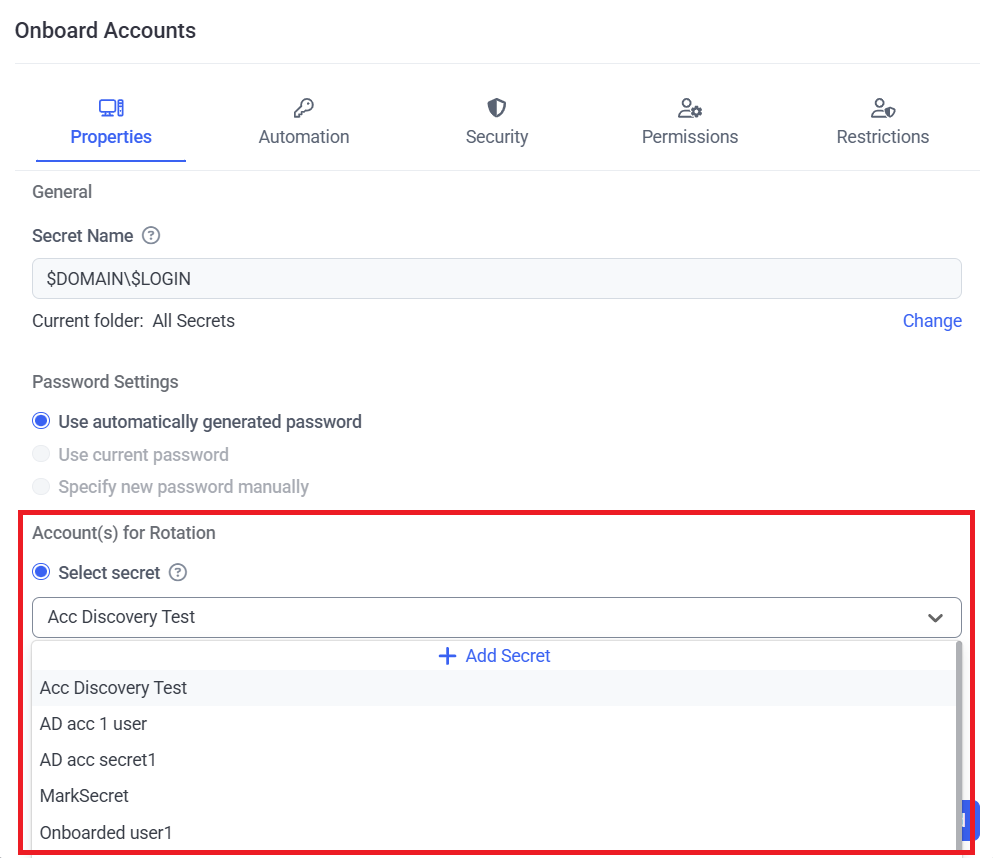 • [Account Discovery:] A secret can now be used for remote password rotation when onboarding Active Directory accounts discovered (in the same way as for Windows local and Linux accounts).