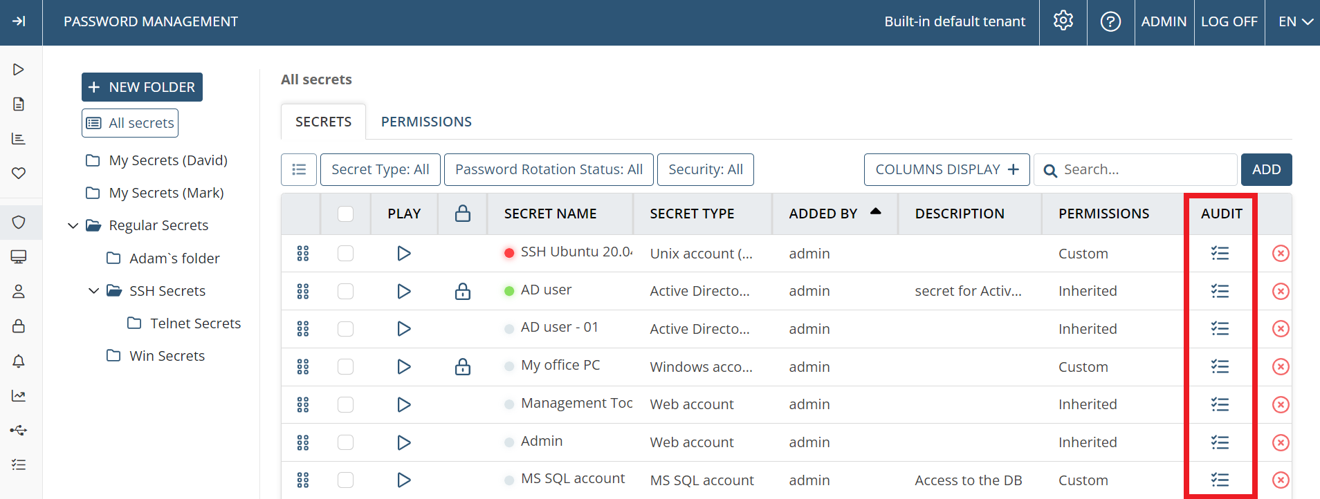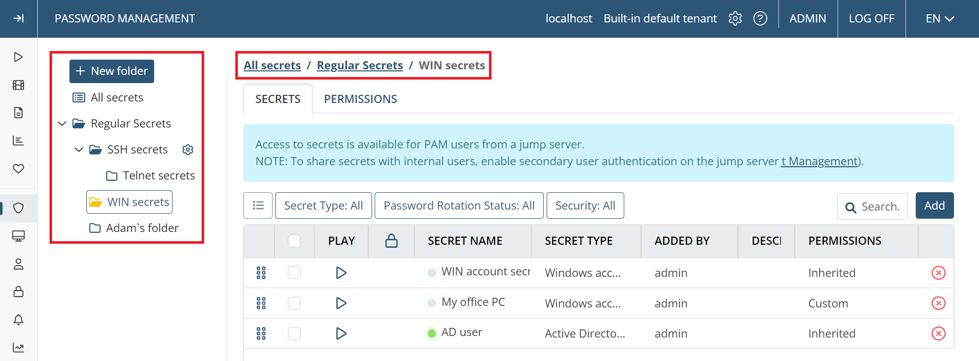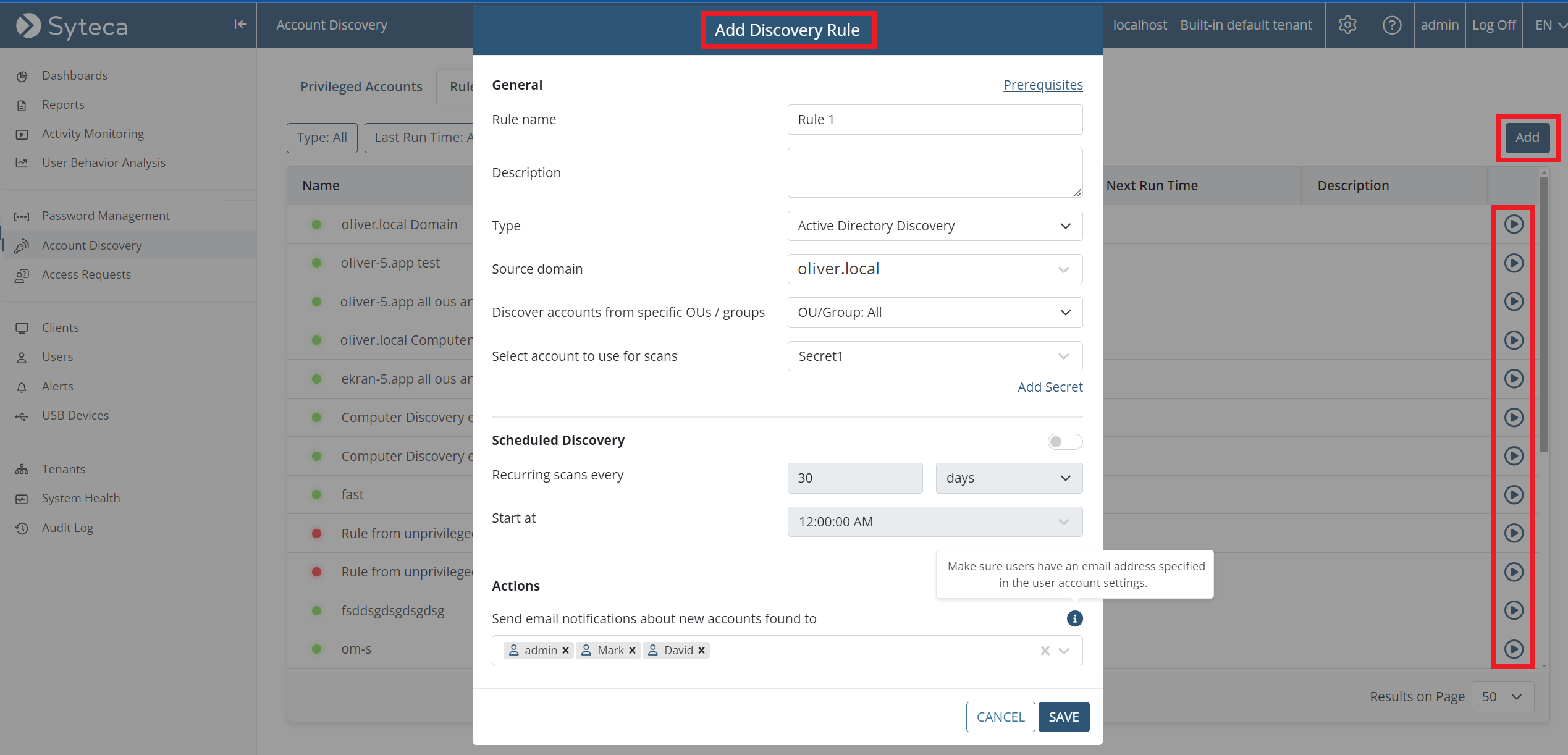 • [Account Discovery:] A secret can now be used for remote password rotation when onboarding Active Directory accounts discovered (in the same way as for Windows local and Linux accounts).