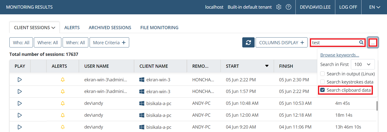 • [Monitoring Windows Clients:] The Sensitive Data Masking feature is now available to allow custom regex values to be defined so as to detect and mask sensitive clear text data (e.g. passwords, SSNs, credit card numbers, etc.) on Windows Client computers that is displayed in the Session Viewer (currently supported for: MS Word, MS Outlook (new and classic versions), Google Chrome, MS Edge, Notepad++).