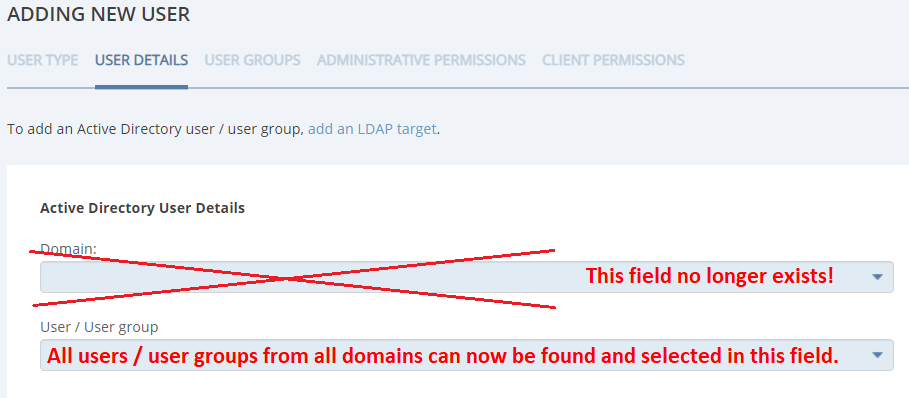 • [LDAP Targets:] Endpoint computers were erroneously displayed in the "Domain" drop-down list in the "Update data for AD user groups" popup window (when syncing Active Directory user groups manually) - fixed.