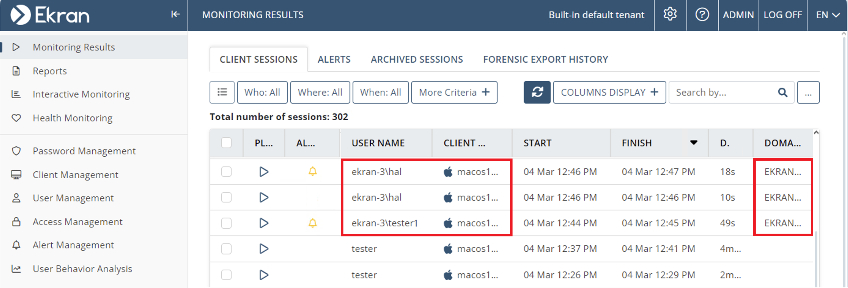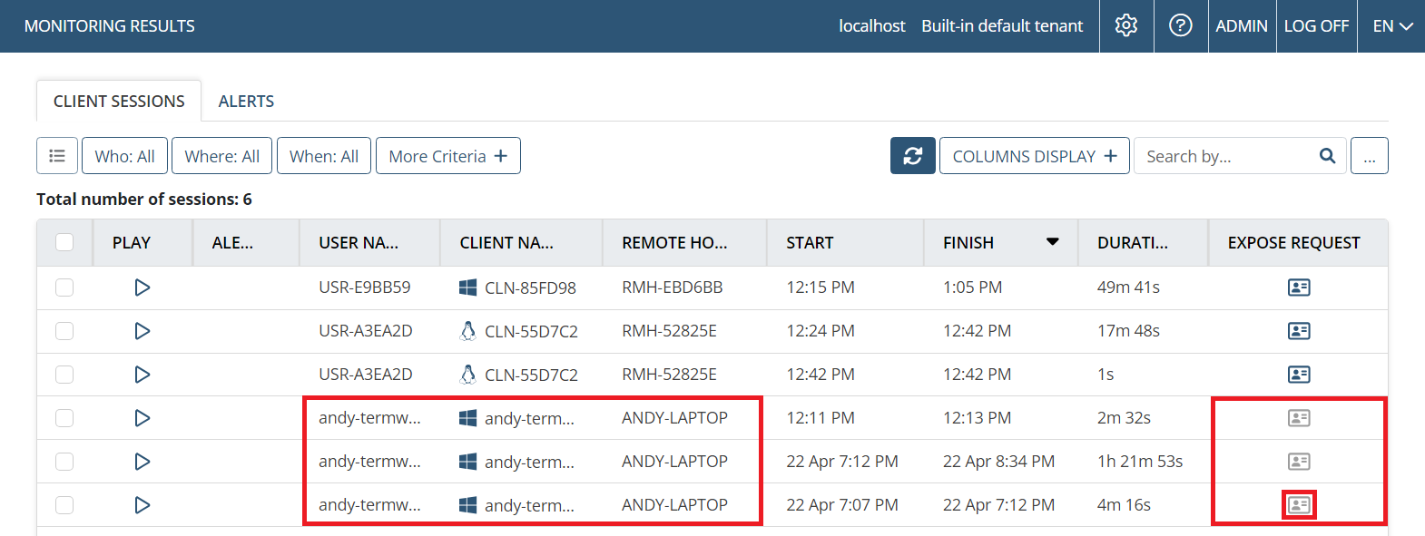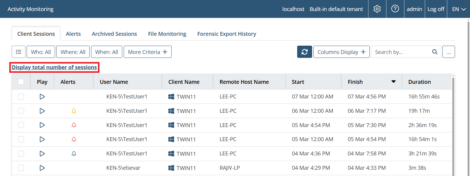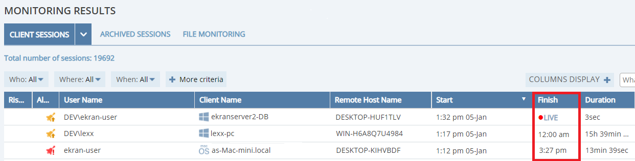 • [Viewing Client Sessions:] Sessions outside of the date range specified in (the "Between" option of) the "Last Activity" filter were displayed in the Client Sessions list - fixed.
