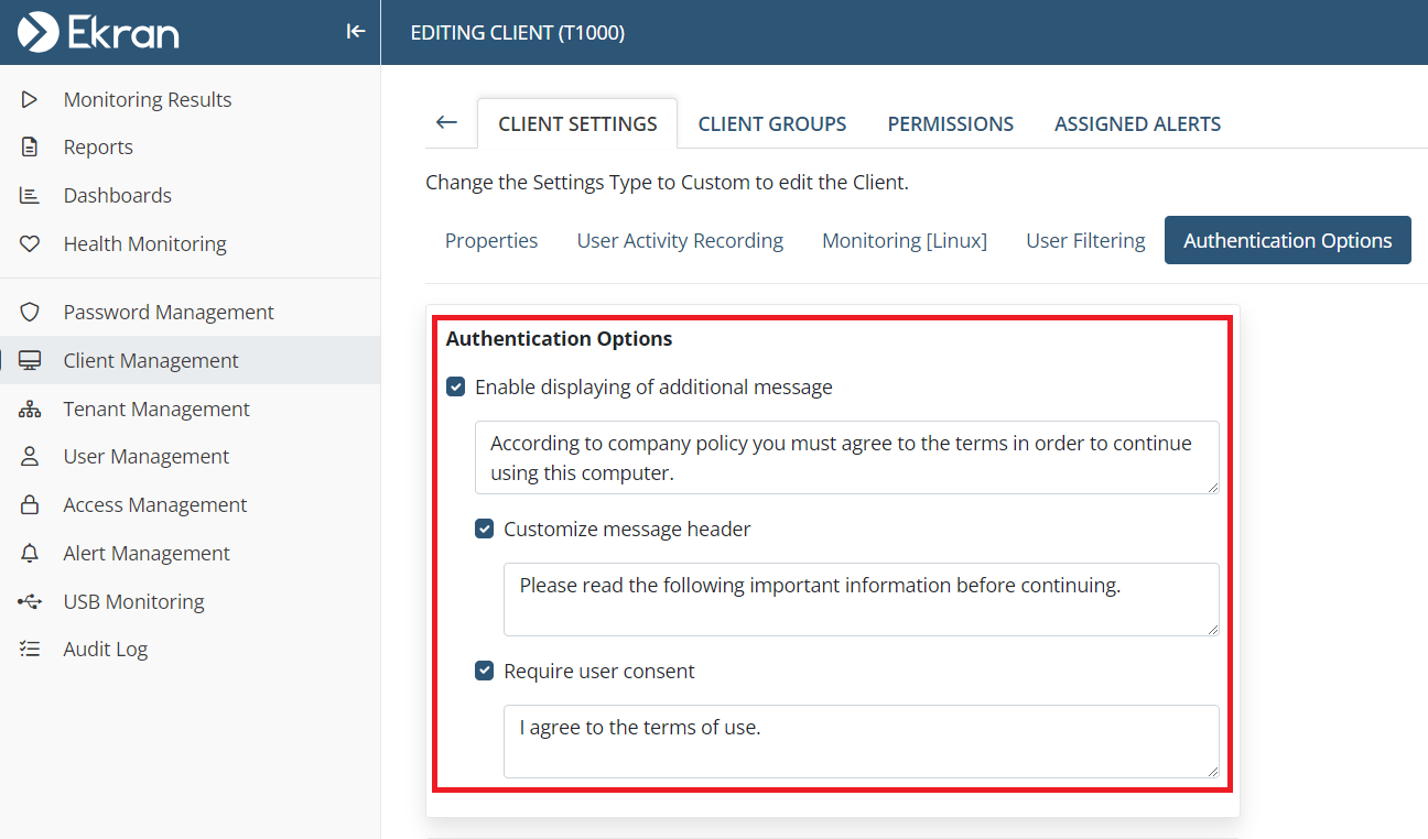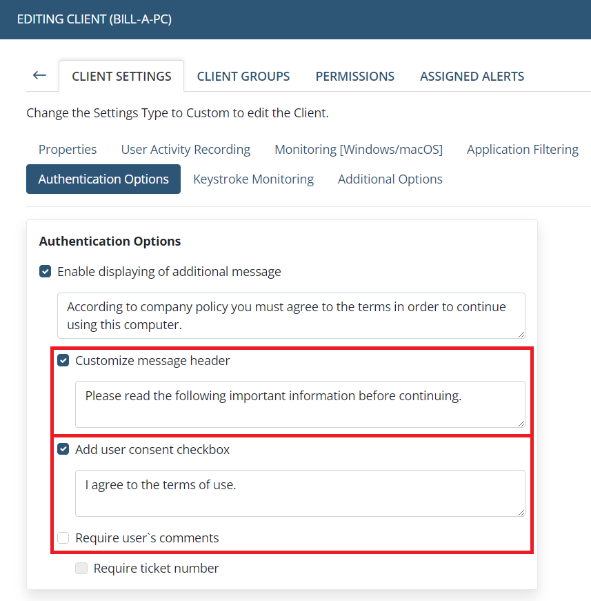 • [Displaying of an Additional Message on Login to Windows Clients:] It was not possible to configure the "Message display frequency" option if the "Require user consent" or "Require user`s comments" options were enabled - fixed.