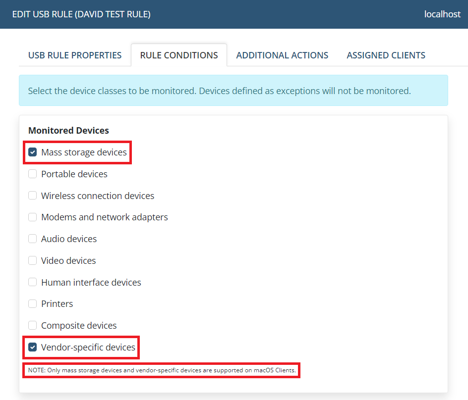 • Assigning kernel-level USB monitoring rules. USB blocking rules (temporarily) cannot be assigned on Windows 10 Clients version 1909 or higher.