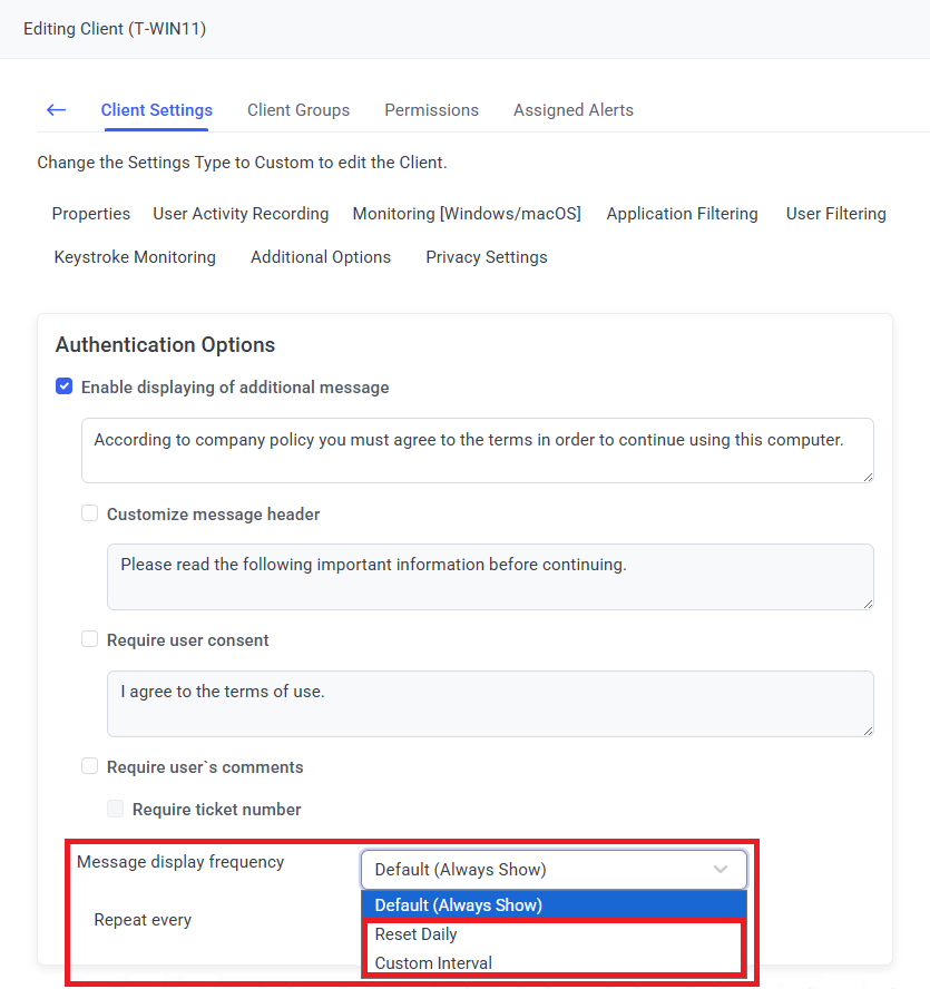 • [Displaying of an Additional Message on Login to Windows Clients:] A custom message display frequency can now be configured to stop the additional message being displayed every time any user logs in (on the same day, or until a specified number of hours have passed).