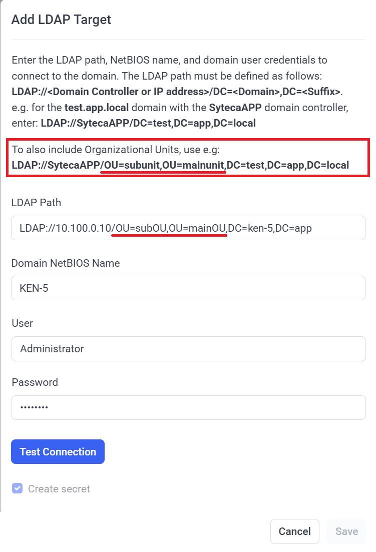 • [LDAP Targets:] The account (credentials) used in LDAP targets can now be stored in a Password Management secret (e.g. to improve security).