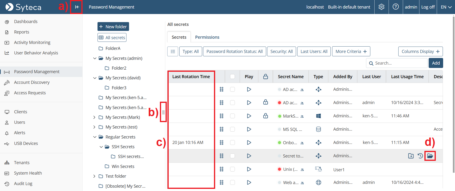 • [Password Management:] Syteca Web Connection Manager is now available for simplified use of secrets (as an alternative to the desktop version of Syteca Connection Manager) by launching them directly from the Password Management page (which also has a new layout) in the Management Tool, either in the browser (i.e. agentless PAM) or locally.
