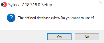 13. If the Syteca database (i.e. actually consisting of the 3 separate databases shown above) already exists, which was created either manually or when using previous installations of Syteca Application Server, you will be offered to use it. If you want to use the existing database, click Yes. Otherwise, click No and a new database will be created.