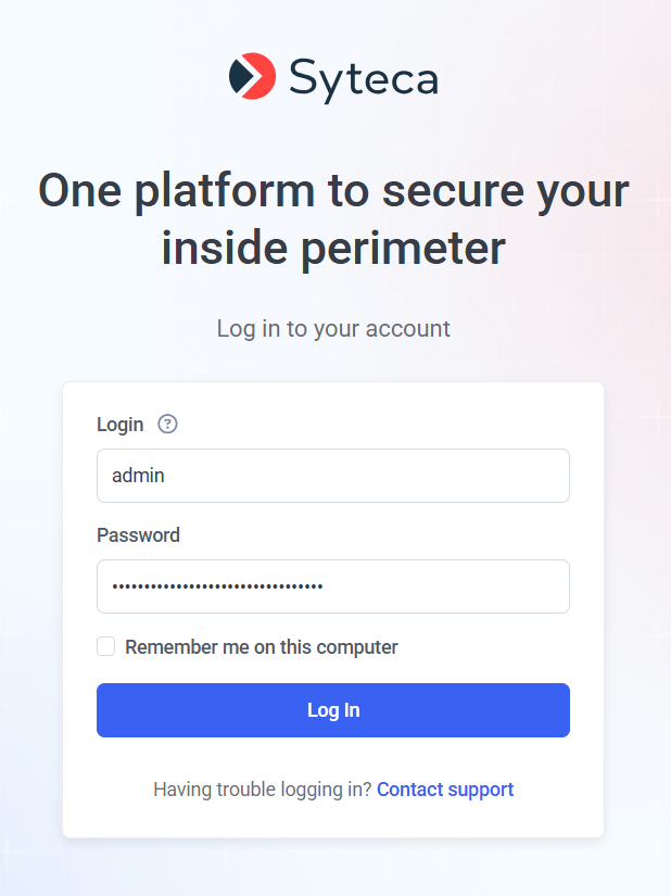 2. Enter the default Login “admin” and the Password that was defined during installation of Syteca Application Server.