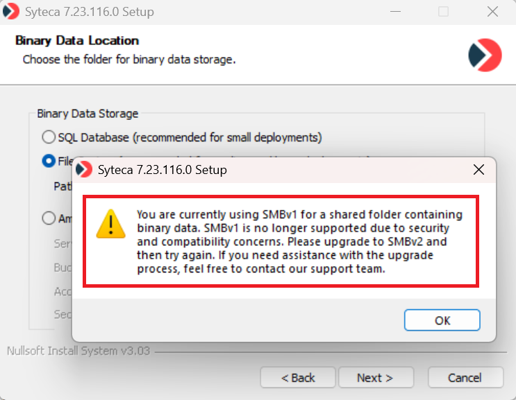 NOTE: If the following popup message is displayed about needing to update to SMBv2 when using a File System folder to store binary data (while updating to Syteca 7.23 or higher), please refer to the Application Server Issues and Error Messages page for more information: