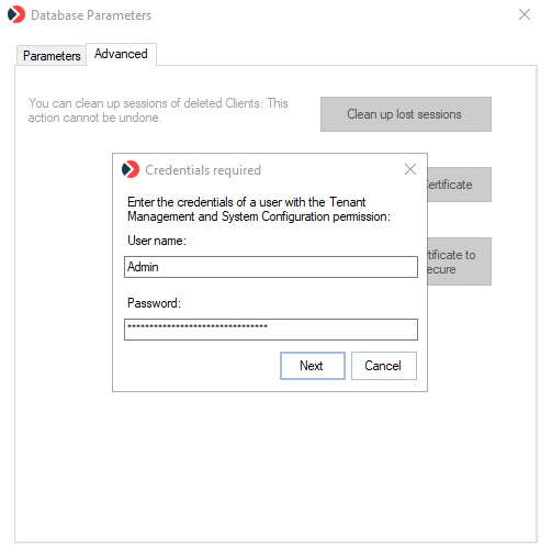 4. In the Credentials required pop-up window that opens, enter the User name and Password of a user with the administrative Tenant Management and System Configuration permission in the corresponding fields, and then click Next.