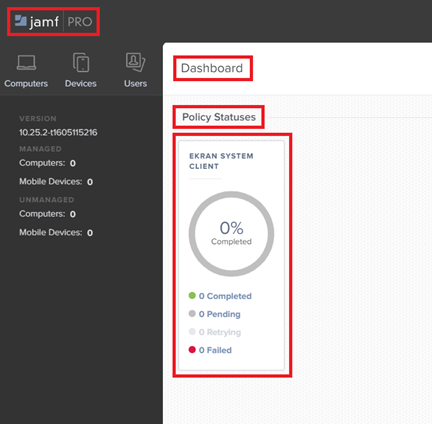 10. After creating the policy, the agent installation will start after 15 minutes (by default). You can view the installation progress on the Jamf Pro Home page, on the Dashboard, under Policy Statuses.