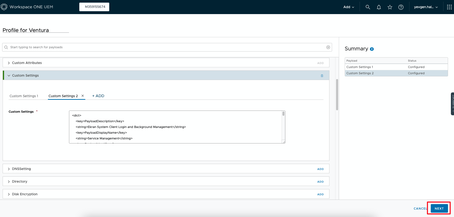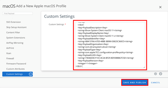7. Copy the contents of the Ekran System Client macOS 11.x.xml file into the empty Custom Settings field.