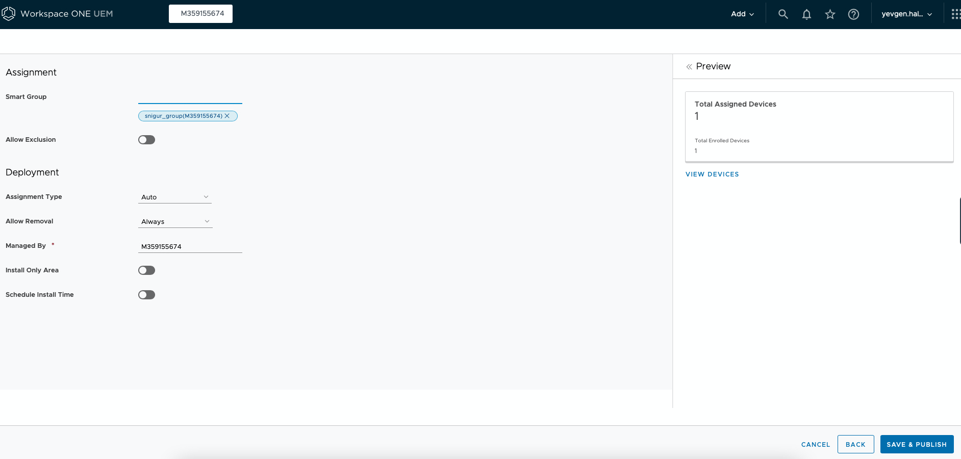 8. Click the Publish button in the bottom right, and the profile will now be installed on the computers in the device group which you defined in the Smart Groups combo box above.
