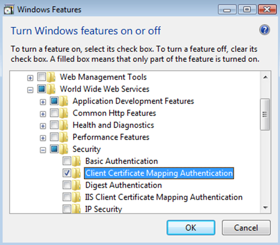 3. Expand Internet Information Services, expand World Wide Web Services, and expand Security, and then select the Client Certificate Mapping Authentication checkbox.