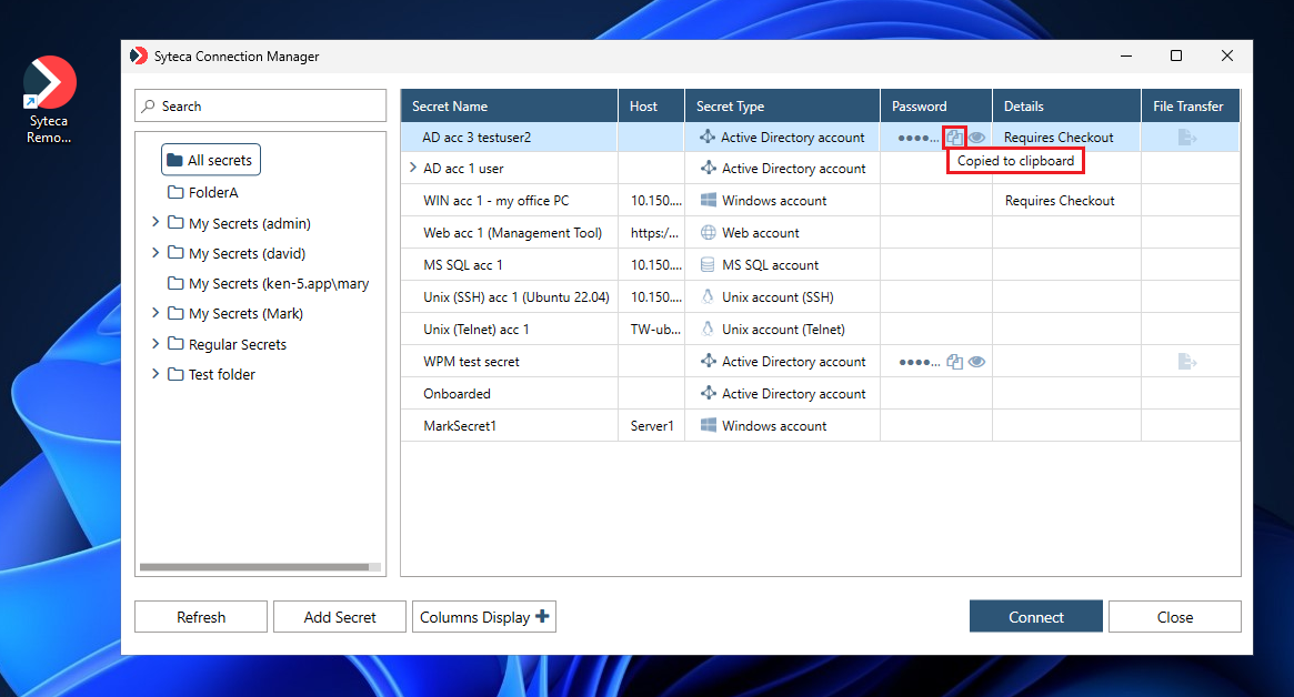 To view and/or copy a secret's password in Syteca Connection Manager, do the following: