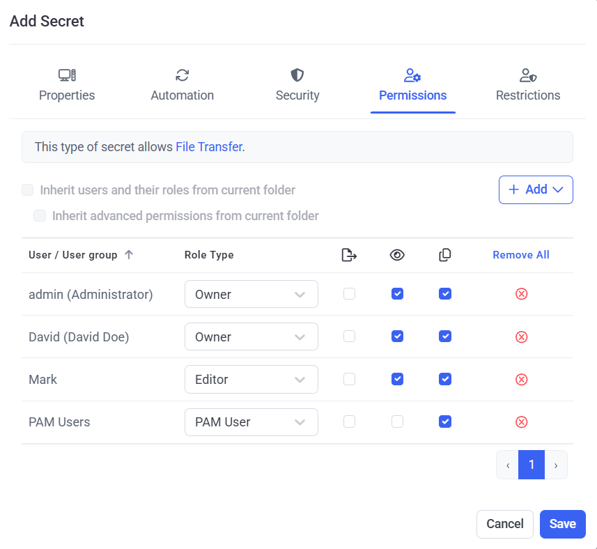 - In the Role Type column, select the Role Type permissions (Owner, Editor, or PAM User) required.