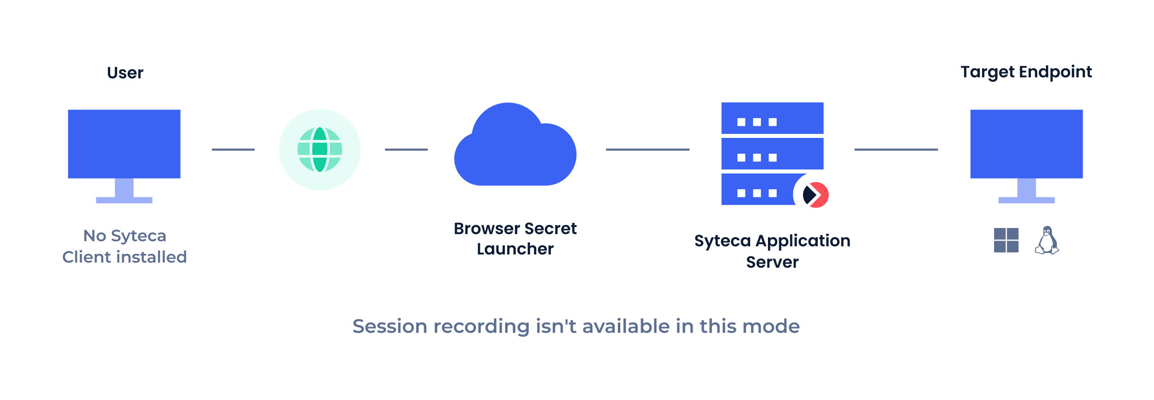 • Launch in browser (also known as agentless PAM): Allows Active Directory account, Windows account, and Unix account (SSH) secrets to be launched in the browser on any computer, and does not require the Syteca Client to be installed, since user activity cannot be monitored and recorded:
