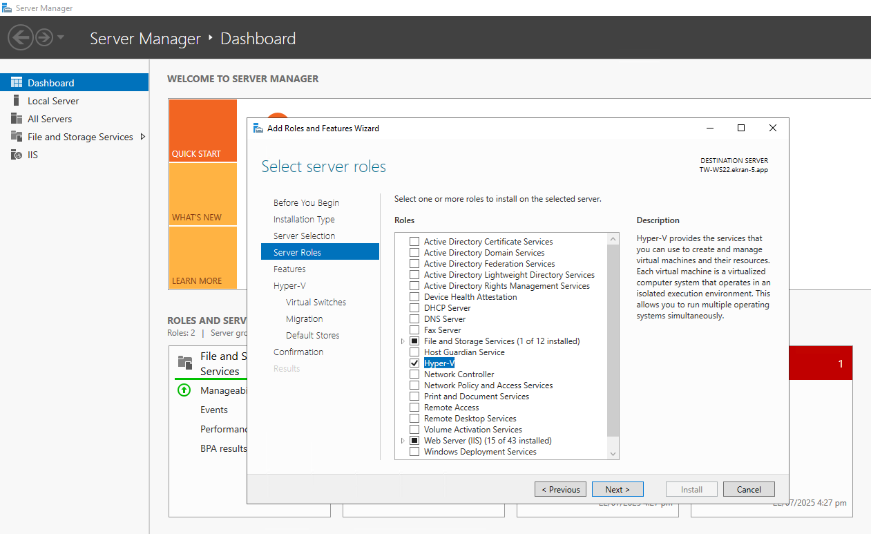 1. Use Windows Server Manager to install the WSL feature and Hyper-V role (to be able to enable the Enable Syteca Web Connection Manager toggle, so as to use the Launch in browser option), as shown in the following screenshots (examples using Windows Server 2022):