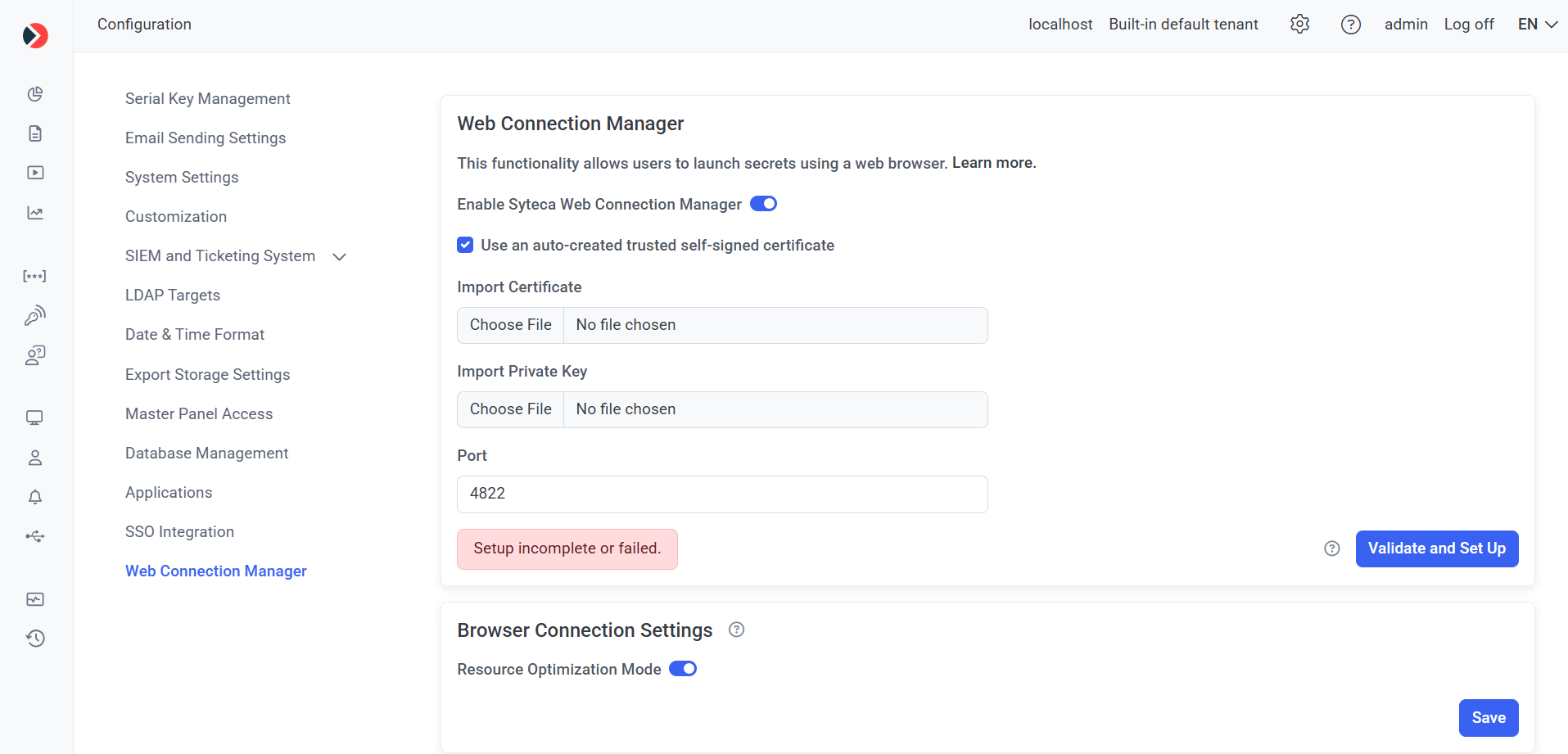 4) Optionally, in the Browser Connection Settings section, move the Resource Optimization Mode toggle to left to disable it, and then click the Save button (in the bottom right).