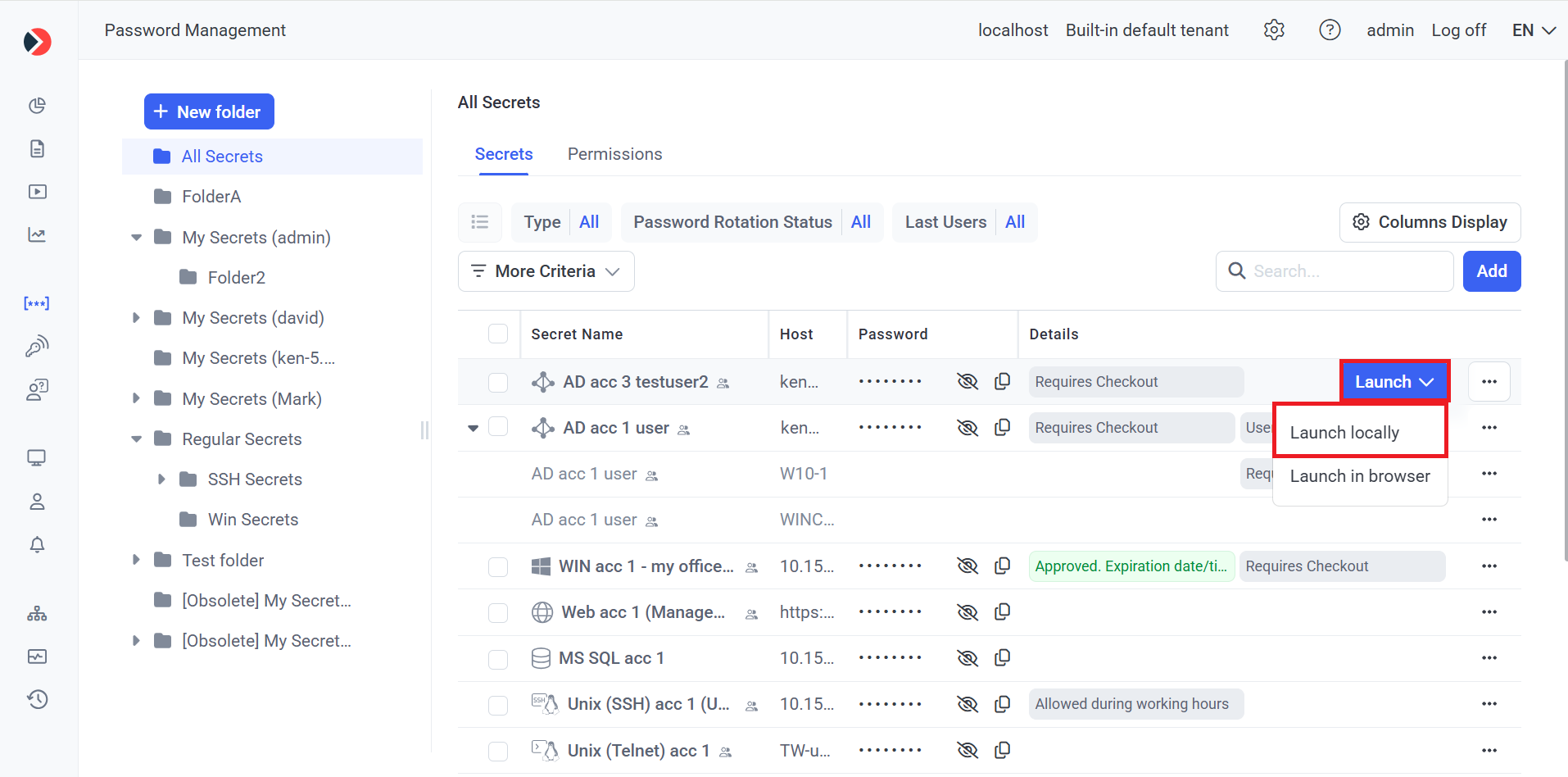 3. In the drop-down list that is displayed, select the Launch locally option to connect to the secret in the third-party application that is then launched locally.