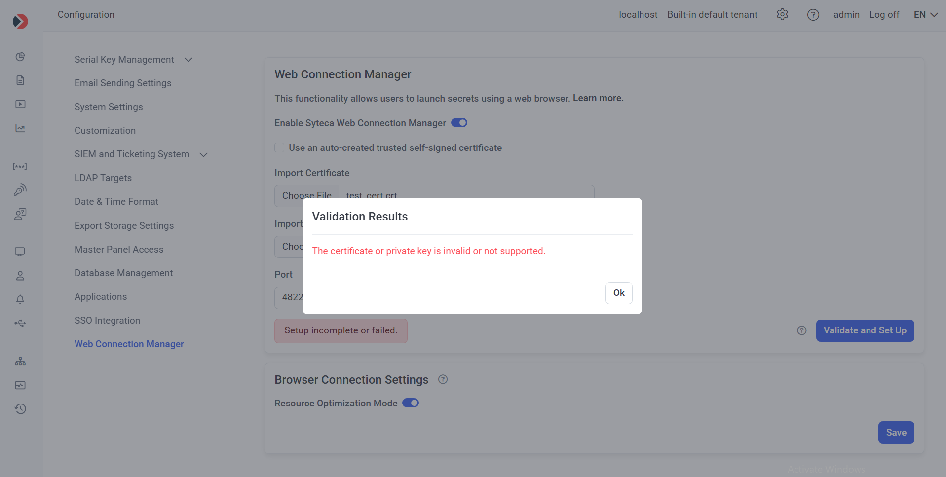 f) If the connection validation and set up fails, the message “Setup incomplete or failed.” is displayed, and the Validation Results pop-window displays one of the following error messages (in which case this issue needs to be fixed before proceeding as described below):