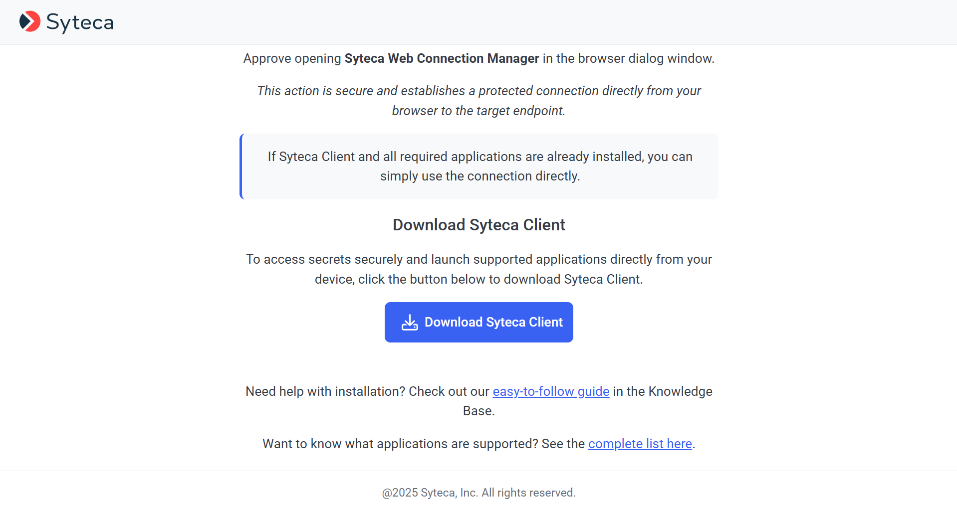 5. If the Syteca Client has not yet been installed in this specific way, click the Download Syteca Client button to download it, and then install it (in the usual way).