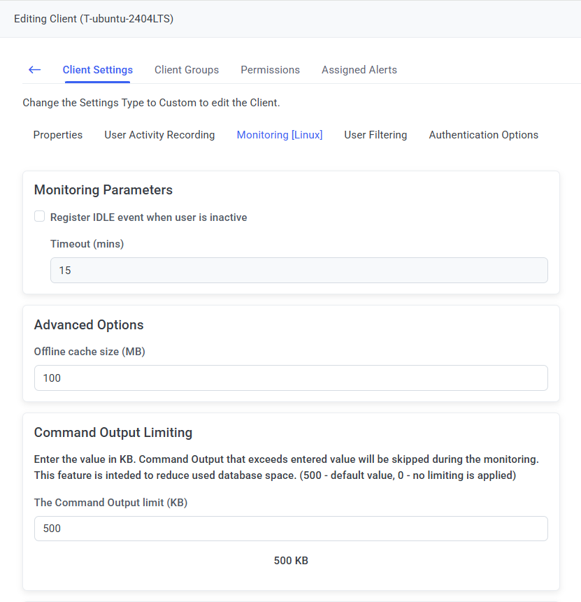 To modify the command output limit, on the Editing Client / Editing Client Group page, select the Monitoring [Linux] tab, and in the Command Output Limiting section, enter the required value in The Command Output limit (KB) field, where the default value is "500", and a value of "0" means that the limit is disabled so that no limit is applied.