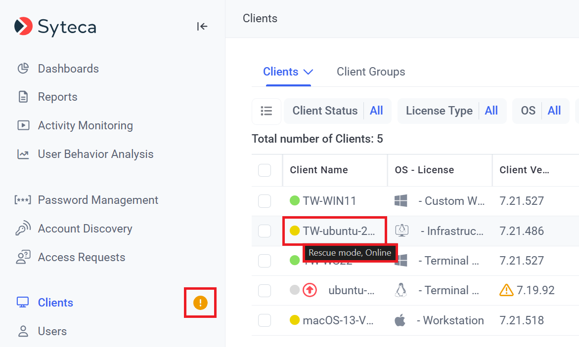 If any Linux Clients are displayed with the yellow (Rescue mode) status (