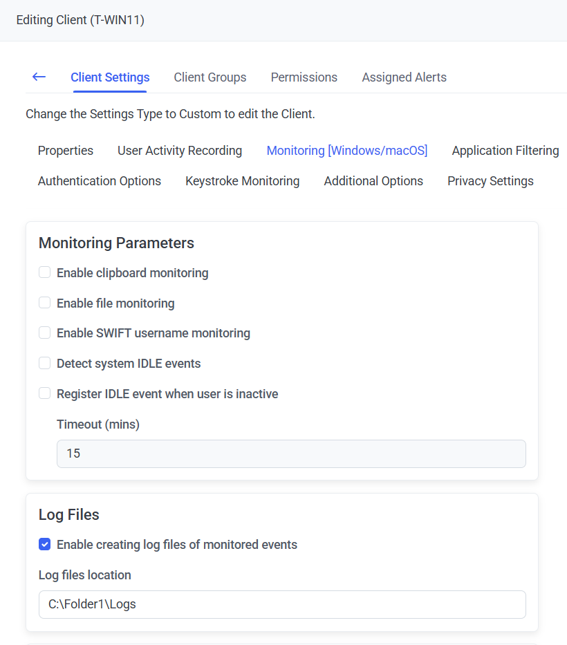 [ActivityLogsParameters] MonLogging=1 LogPath=C:\1\Logs | On the Monitoring [Windows/macOS] tab, in the Log files section, do the following: 1. Select the Enable creating log files of monitored events checkbox. 2. In the Log Files Location field, enter: “C:\1\Logs”. |