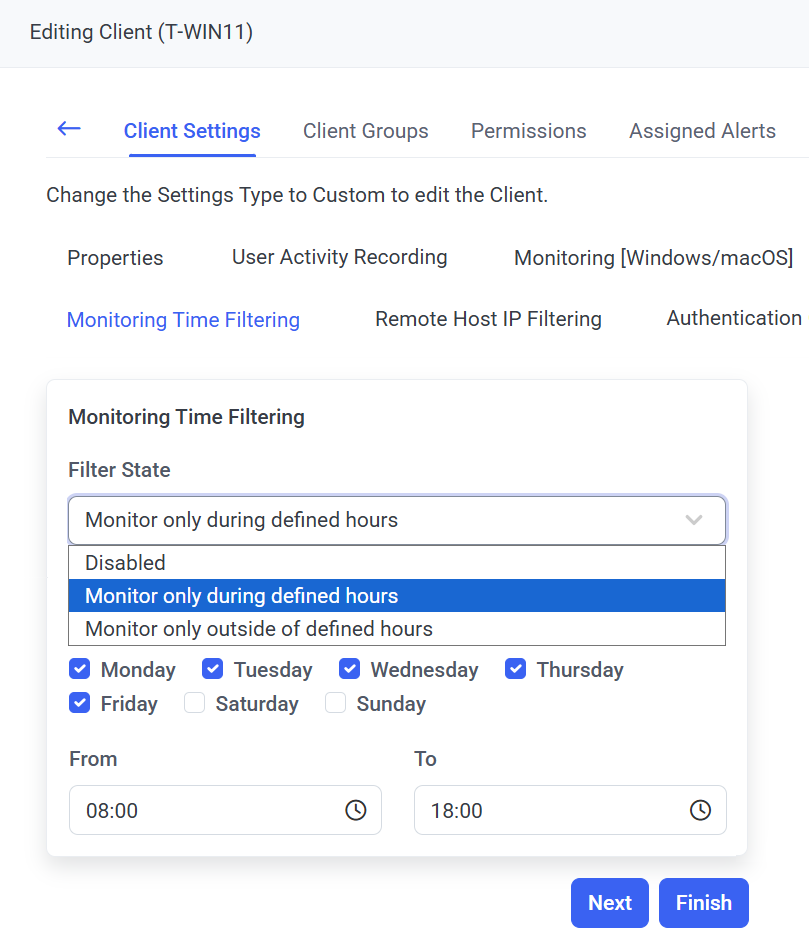 Monitoring time filtering allows you to reduce the amount of information received from the Windows Client by defining the days of the week and hours during which the Client will record user activity.