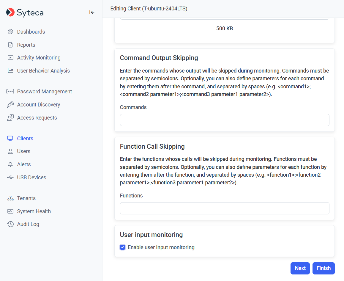3. In the Management Tool (while editing a Client / Client Group), on the Monitoring [Linux] tab, in the User input monitoring section (at the bottom of the page), select the Enable user input monitoring checkbox.