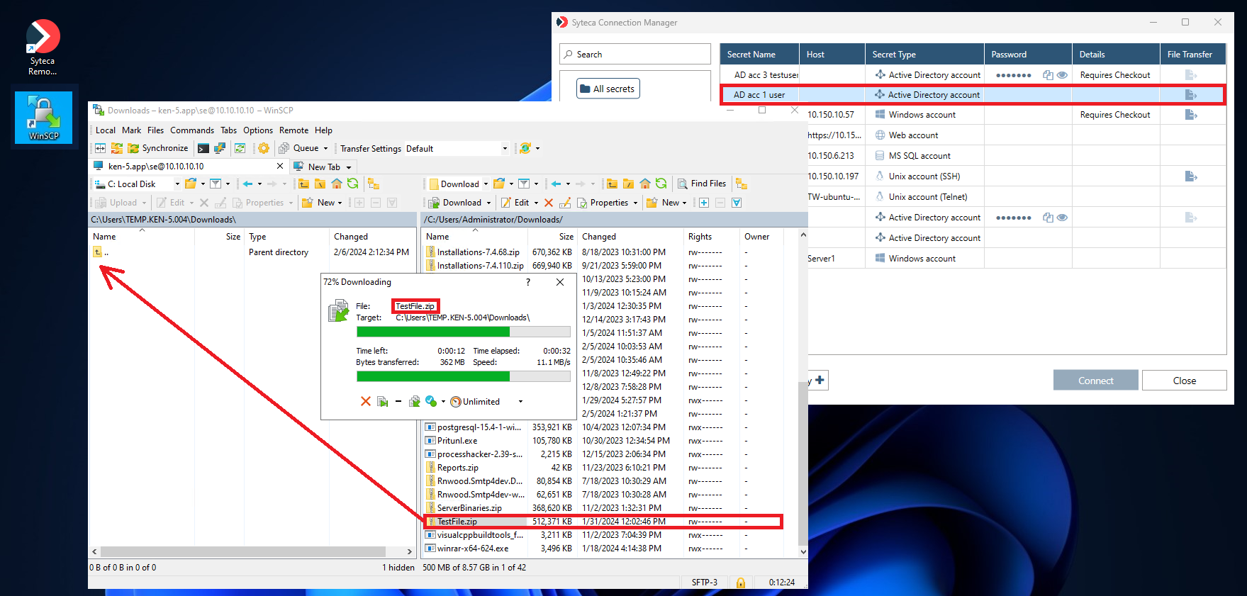 The File Transfer feature allows users of secrets to transfer files between the computer with Syteca Connection Manager and the remote computer (i.e. the computer with the account that the secret accesses) via Syteca Connection Manager by using the WinSCP (Windows Secure Copy) application version 6.0 or higher (which must first be installed, and added to the PATH environment variable, on the Client computer).